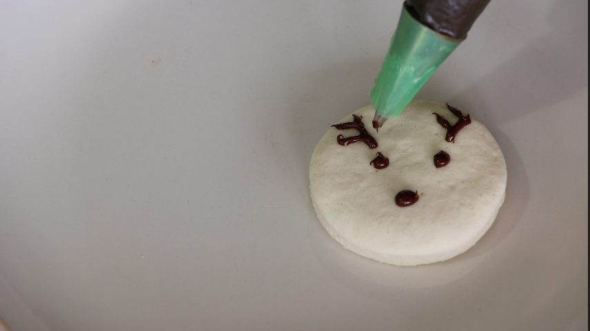 3. Estirar entre dos hojas de papel de hornear de 3-5 mm de grosor. Recorta con una forma (tengo 4,5 cm). Hornea a 180 grados 12-15 minutos. Decora con chocolate y caramelo como se muestra en el video.