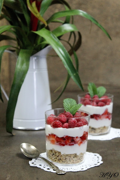 Mi idea favorita, estas copas son de IKEA. Para decorar esta ocasión encima del yogur añadimos un poco de galletas Digestive trituradas, lo que dará color y textura a la hora de comer, un plus a este postre :)