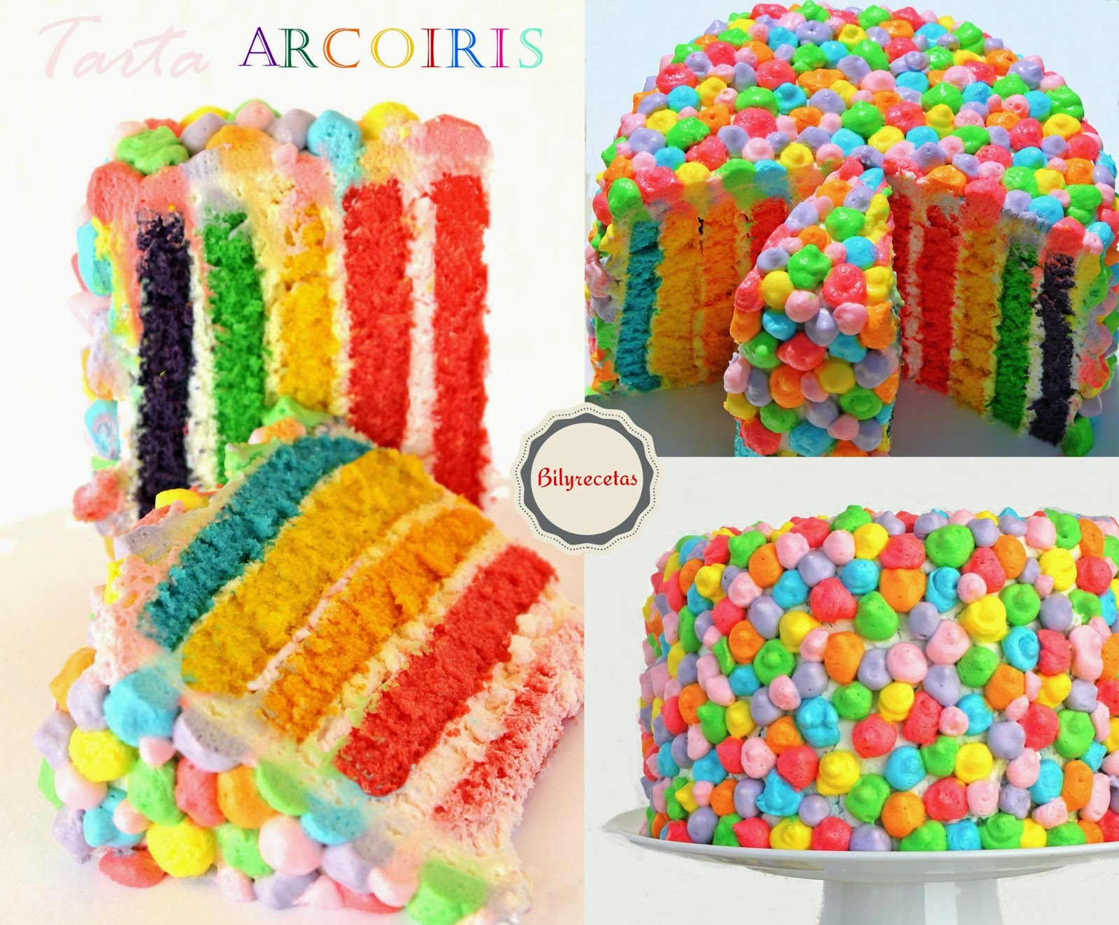 Y en último lugar, una elaboración que es más compleja, pero será la reina de la fiesta, la Tarta Arcoíris (pincha en el nombre para ver la receta completa ). de Bilyrecetas: