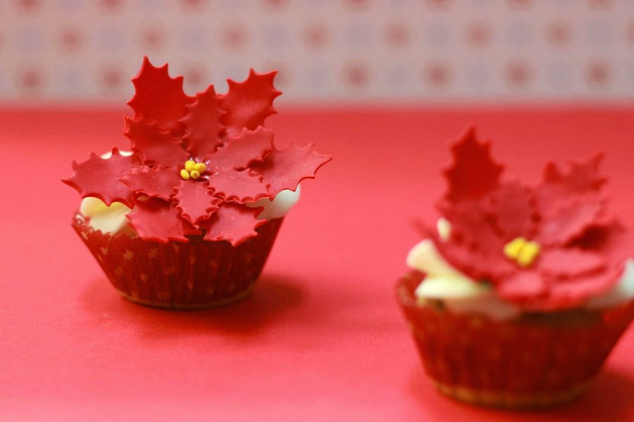 Necesitaras pasta de goma en rojo y amarillo, cortar y pegar una sobre otra, dejar secar y ponerlas sobre la superficie a decorar. La explicación del paso a paso lo puedes ver a continuación haciendo clic en: La bella Poisenttia o Flor de Pascua