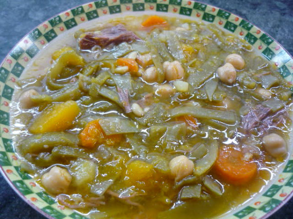 500g garbanzos remojados 1 aceite de oliva un chorreón 1 apio 1puerro 1 calabaza, un trozo 1 patata 1 cebolla 2 habichuelas 3zanahorias 1 nabo 2 chorizo 2 morcilla 500g un trozo de carne 1 un hueso salado 1 tocino fresco un trozo o sal a gusto 1 medio trasero de pollo