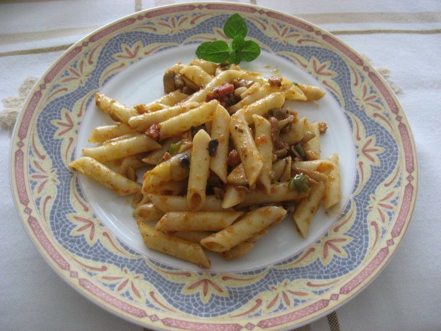 Cocemos los macarrones con una hoja de laurel, chorrito de aceite, pastilla de caldo vegetal (opcional). Por otro lado, picamos el resto de ingredientes muy picadito y los pochamos en la sartén incorporando el pimentón lo ultimo para que no se queme. Cuando estén los macarrones, añadimos por encima los ingredientes. Servimos caliente.