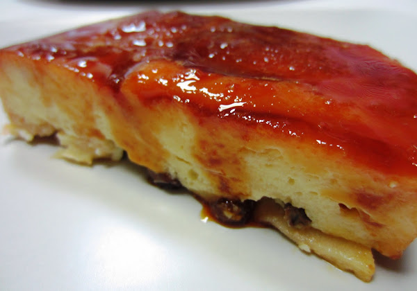 Ponemos en el molde caramelizado, una capa de láminas de pera, encima de las peras ponemos dos capas de rebanadas de bollo suizo o brioche, luego otra vez otra capa de peras y encima más brioche. Seguimos así hasta que terminemos peras y brioche. Añadimos el batido de huevos, azúcar, ron, leche y nata.