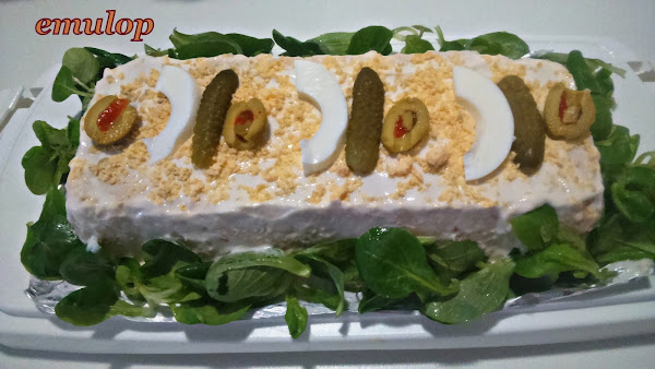 Desmoldamos el pudin le echamos mayonesa y la vamos pasando con un cuchillo para que nos quede lisa y decoramos con huevo pasado por el rallador, aceitunas, pepinillos y canónigos.