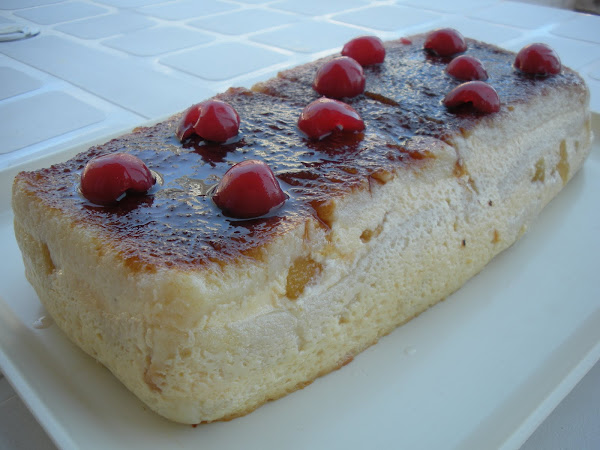 Ingredientes:1/2 litro de leche 1 lata de melocotón en almíbar de 420 gr 5 guindas 4 yemas de huevo 1 trozo de canela en rama 100 gr de azúcar 8 rebanadas de pan de molde sin corteza Caramelo líquido Mantequilla Ponemos la leche a cocer con la ramita de canela. Mientras tanto batimos las yemas con el azúcar, y una vez haya empezado a hervir la leche vertemos un poco sobre las y ...