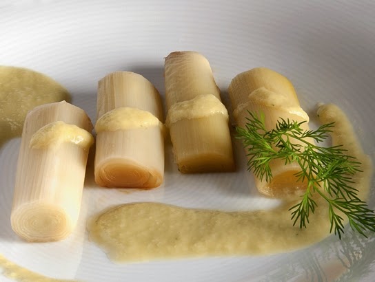 Dado que el 90% del puerro es agua y que posee propiedades diuréticas y laxantes, resulta ser una hortaliza que todos los guardianes de las dietas y contadores de calorías deberían elevar a los altares de la Santa Iglesia de lo Saludable. Bromas aparte, lo cierto es que el puerro con su exquisito sabor que recuerda un poco a la cebolla, aunque bastante más suave, es un ingrediente imprescindible en guisos, estofados y salsas. Hervidos o al vapor pueden utilizarse en ensaladasacompañados de unos ahumados o con una sencilla vinagreta. Pero es asados, como en nuestra receta de hoy, como resultan sencillamente irresistibles: todo su delicado sabor y su suave aroma regalan nuestro paladar y nuestro olfato. Y acompañados con esta salsa en la que el vino blanco y el eneldo añaden su nota perfumada se convierten en un r plato de primera categoría.