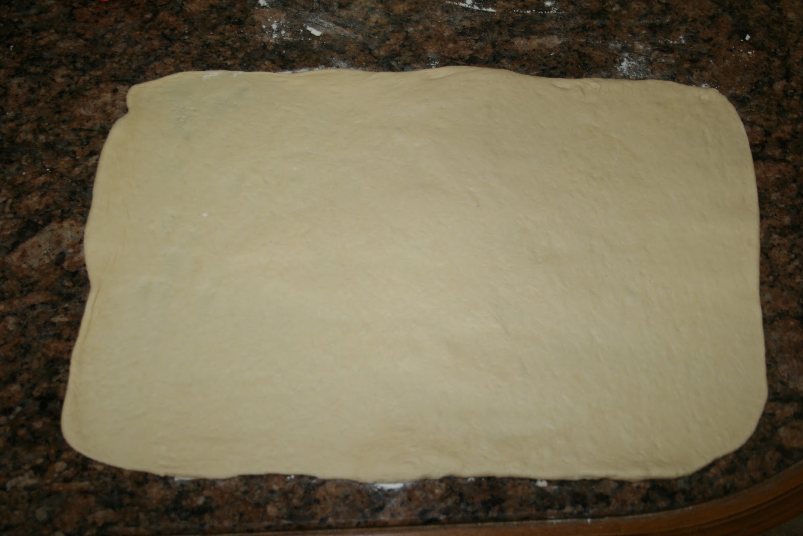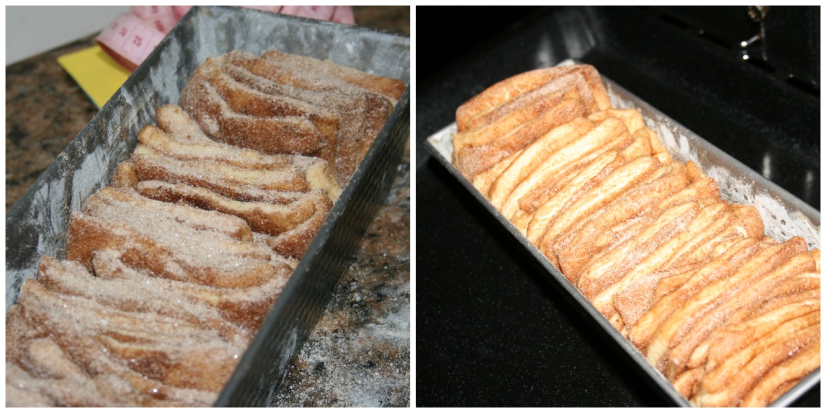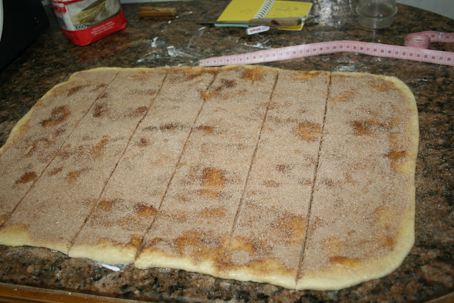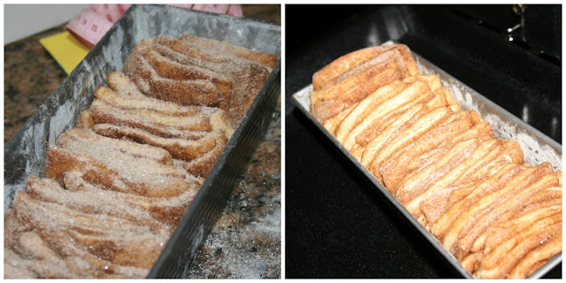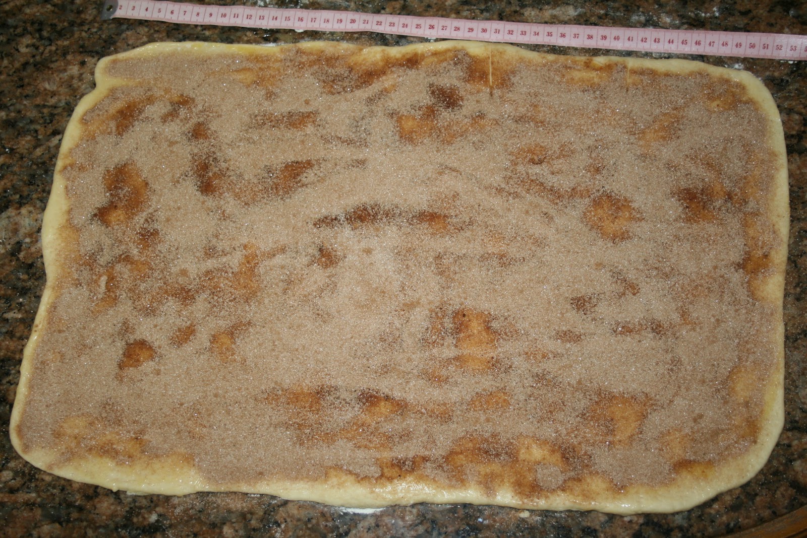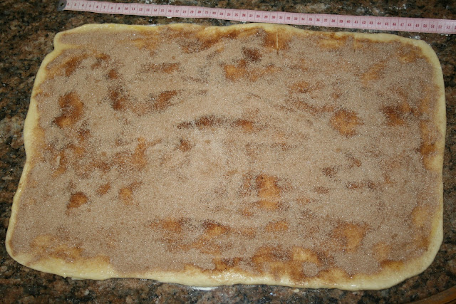 Ahora toca estirar la masa sobre una mesa poniendo algo de harina debajo porque nos interesa que , después se despegue bien.Tenemos que hacer un rectángulo lo más perfecto posible. Recuperamos los ingredientes del relleno y derretimos la mantequilla , pincelamos la masa y espolvoreamos con la mezcla de azúcar y canela. Y ahora me fui a la caja de costura a por el metro de modista.Medí el rectángulo y dividí en 6 partes porque tenemos que cortarlo por los lados más cortos.Así: La maniobra más difícil viene ahora; tenemos que despegar las tiras y ponerlas apiladas unas sobre otras; la masa se estirará y el azúcar se caerá.Intentaremos componer las tiras cuando estén apiladas y el azúcar la recuperaremos luego.Después de apiladas volvemos a medir y dividimos de nuevo en 6 trozos en vertical. Engrasamos un molde con un poquito de mantequilla(yo lo hice con la misma derretida del relleno)y espolvoreamos de harina. sacudimos el exceso y rellenamos el molde con los trozos de masa puestos"de pie".Sólo nos queda recuperar la mezcla de azúcar que se ha caído y espolvorear por encima de la masa.Tapar y dejar levar, de nuevo, una hora y media o dos horas. Antes y después de levar dentro del moldeHornear unos 45 minutos minutos a 200º; si se dora mucho por encima lo tapáis con papel de plata.Dejar unos minutos e intentar desmoldar.Digo intentar porque se rompe pero hay que comerlo casi recién hecho, es lo suyo. Muchas gracias si habéis llegado hasta aquí porque la cosa no es hoy para tener prisa Y como aquí queda podéis volver cuando queráis.