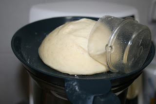 Sólo nos queda amasar 3 minutos en velocidad espiga.En este paso debéis vigilar la masa para que quede con la textura adecuada,se debe despegar de las paredes del vaso pero sin echar mucha más harina.