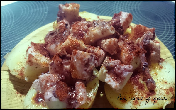 - 200gr de pulpo cocido, pimenton dulce y picante, 2 patatas medianas, sal, aceite.
