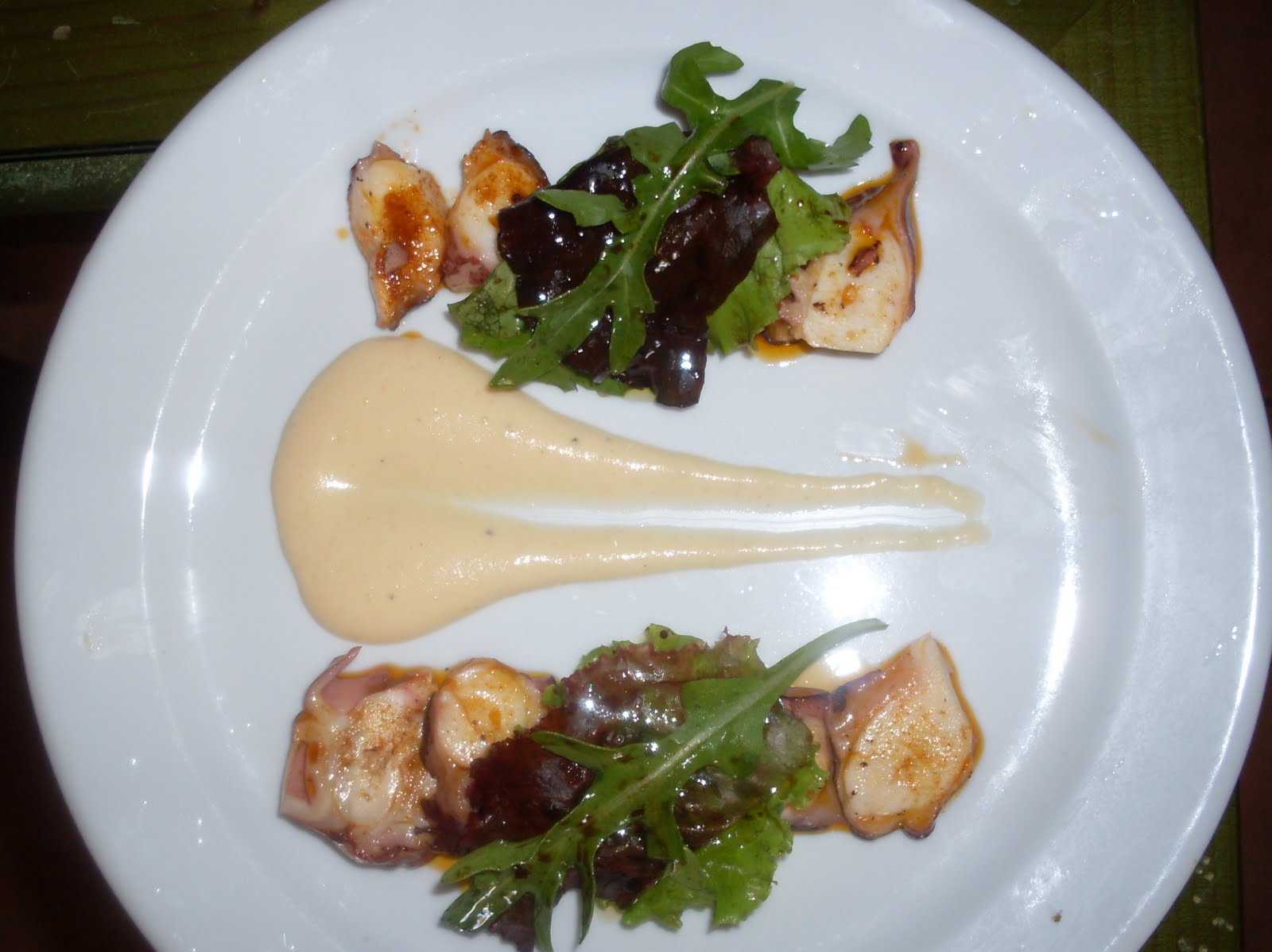 Finalmente, emplatar poniendo una lágrima del puré en medio del plato. A los lados disponemos los trocitos de pulpo templados, regados con el aceite de pimentón y unas escamas de sal maldon. Para decorar colocamos encima unas hojitas de rúcula.