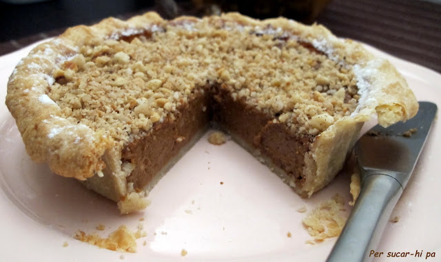 Una versión más clásica de esta tarta es la que veis acontinuación. La masa se hace igual que la anterior (harina y mantequilla), yse rellena igualmente de puré de calabaza, pero en esta ocasión con una mezclade especias diferente y con frutos secos picados para darle un toque crujiente.