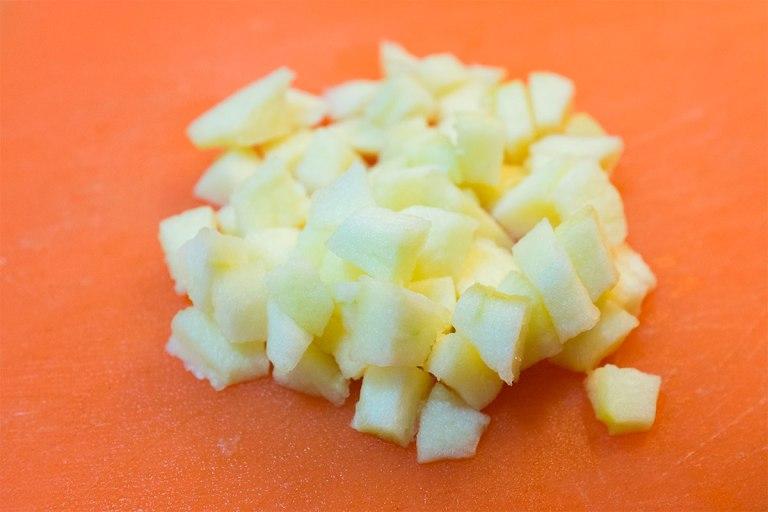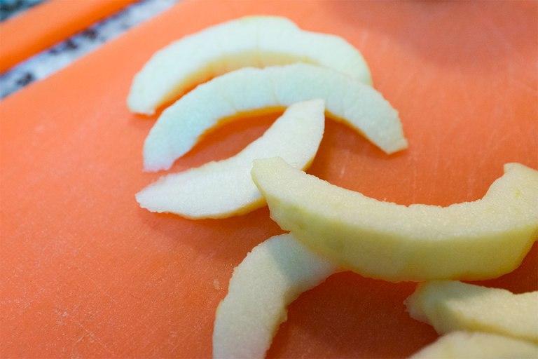Lo primero de todo es pelar la manzana y cortarla en cuadraditos, así que la he partido por la mitad y por la mitad de nuevo, para quedarme sólo con 1/4. Los 3/4 restantes los he dejado sin pelar para que no se oxidara la manzana, que eso sí lo sé que al rato se pone pocha. Como no sabía muy bien cómo hacerlo me lo he inventado y he cortado la manzana como si fuesen barquitos o mini rodajas de melón, después ya he hecho los cuadraditos.