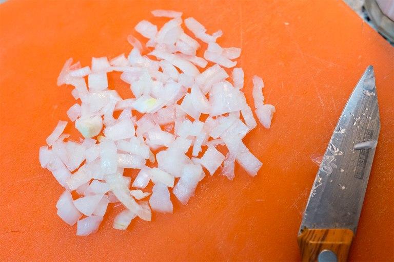 Hay que picar la cebolla y como eso no sé todavía muy bien qué es, pero intuyo que es hacerla muy pequeñita, la he cortado en trozos pequeñitos.