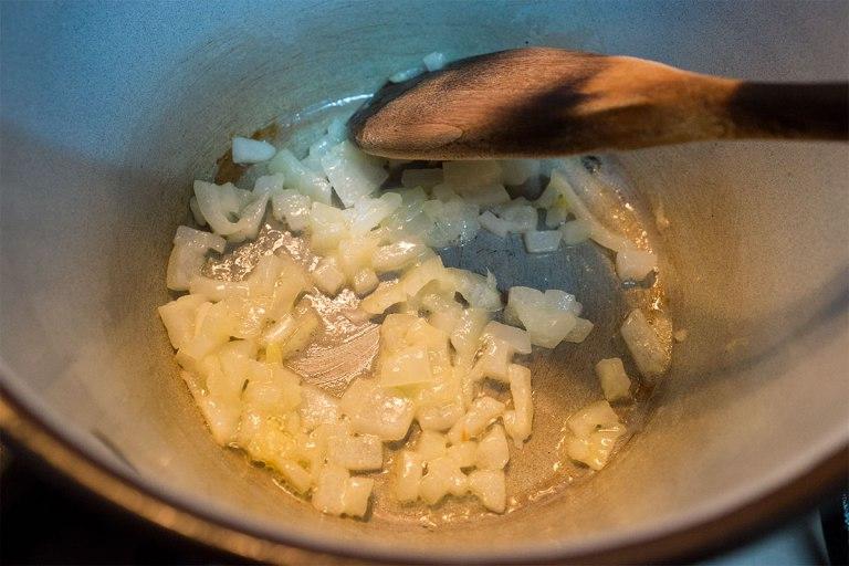 En la receta dicen que hay que dorar la cebolla con la margarina durante 5 minutos. Yo he echado mi mantequilla sin sal y la cebolla en la cazuela a fuego muyyy bajo y he puesto la cuenta atrás del móvil. Los primeros 2 minutos la he estado removiendo para que se deshiciera la mantequilla y parecía que no se hacía la cebolla, así que la he dejado hacerse a su bola otros 2 minutos más, pero cuando me he querido dar cuenta se estaba empezando a churruscar y he tenido que darle meneo para que no se quemara del todo. Así que 5 minutos igual no son…