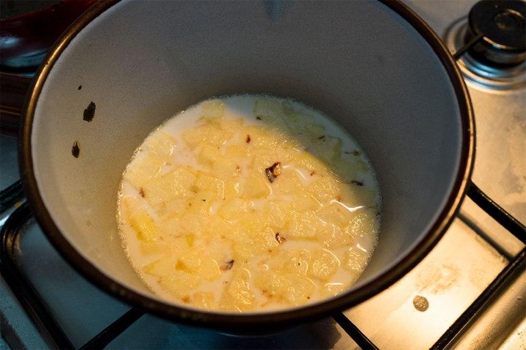 Después hay que añadir la manzana y la leche y hacer hervir todo (yo uso leche de cabra, que la de vaca no me va). Aquí se ve la cebolla medio churruscada flotando en la leche a punto de hervir.