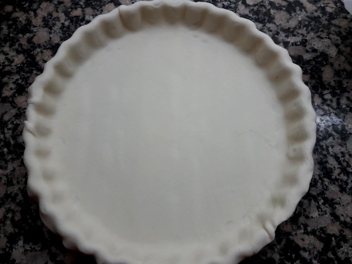Con la ayuda de mantequilla o margarina, atemperada para que sea mas fácil el manejo de la misma, impregnamos bien todo el recipiente para que nuestra masa no se nos quede pegada, y ademas quede crujiente, ahora incorporamos nuestra masa quebrada, con cuidado que nos rellene bien toda la forma de nuestro recipiente.
