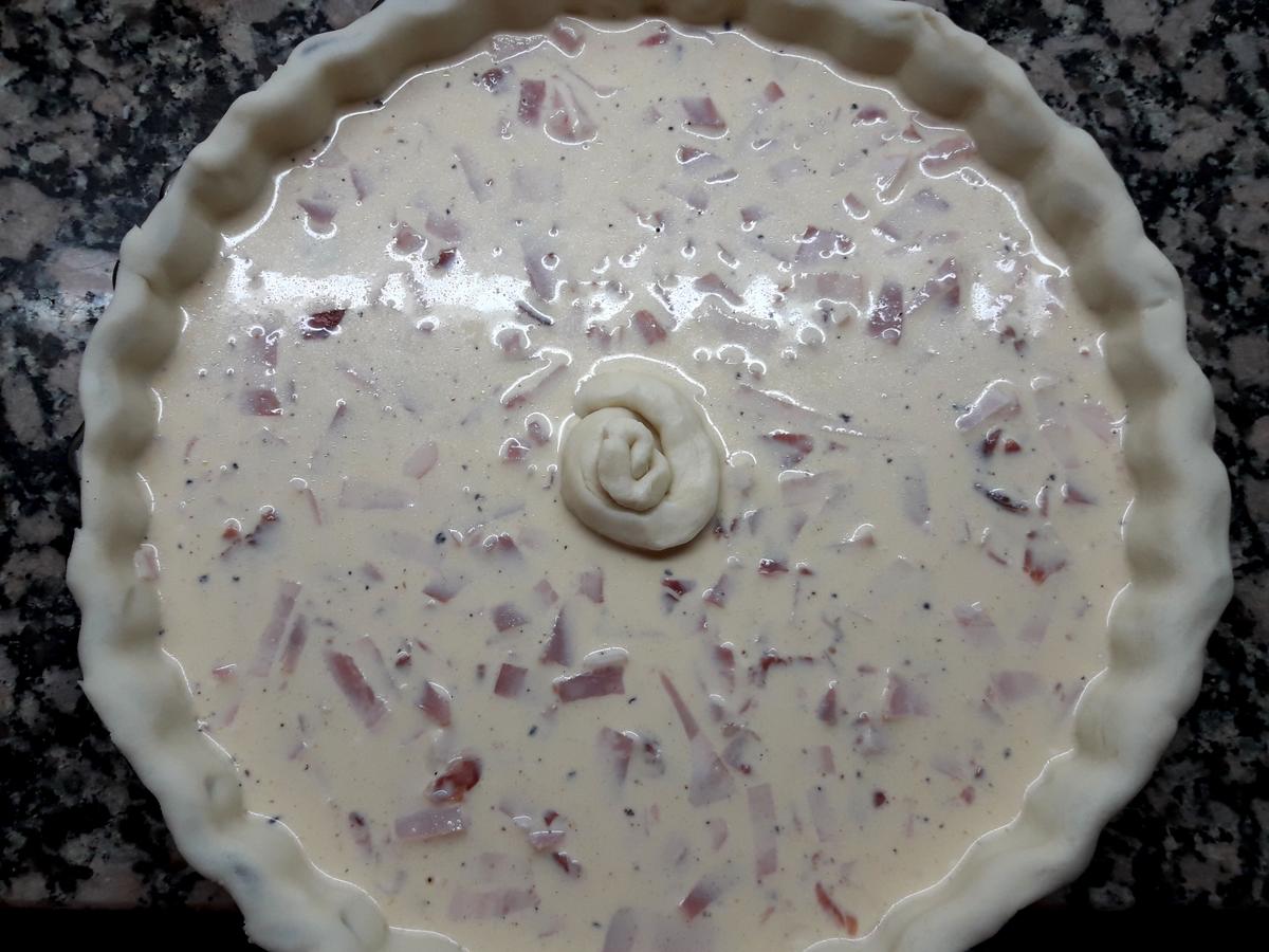Cuando tengamos nuestra base hecha, incorporamos el bacon, cortado en tiras tinas, al igual que el jamón serrano, y el queso enmental bien rallado, y seguimos removiendo para que nos quede bien integrados todos los ingredientes, ahora con la ayuda de una lengua de cocina, vaciamos toda nuestra mezcla encima de nuestra masa que ya tenemos colocada en nuestro recipiente, y al horno, durante 25 minutos, ir vigilando que no se nos queme y sobre todo que quede bien hecho por dentro.