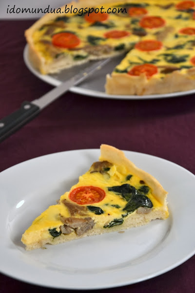 Esta quiche de espinacas, setas, queso y tomates la preparé con lo que tenía en la nevera ese día y nos gustó tanto que la he repetido varias veces desde entonces, como habrás visto si me sigues por Instagram.