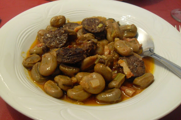 Forrar un molde con la masa quebrada (podéis hacerla vosotros o comprarla hecha), y pinchar el fondo. Verter la mezcla de los huevos y encima repartir bien las habas reservadas.
