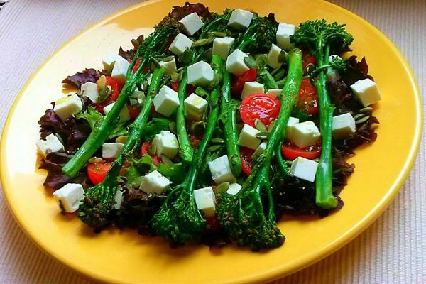 * Montamos la ensalada poniendo en un bol, la quinoa, los minis tomates cherry rojos y amarillos, el bimi crudo y el queso cortado en dados, las setas, los anacardos troceados y aliñamos con la vinagreta.