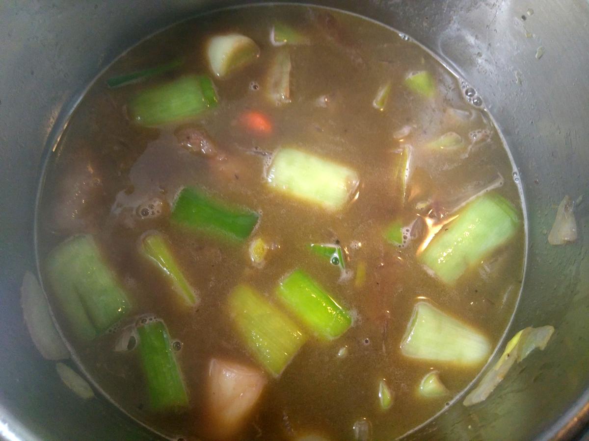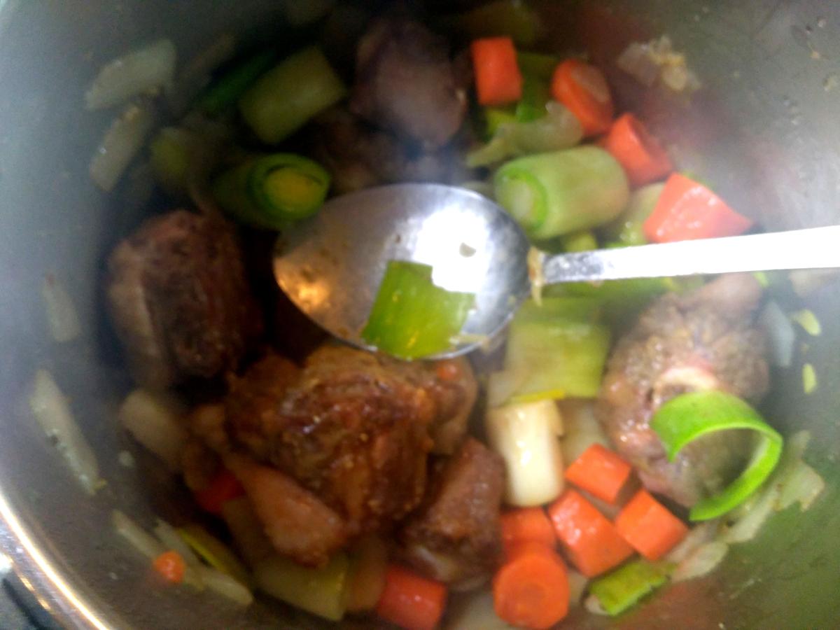 Añadimos una pizca de sal, pimienta negra molida, el caldo concentrado de carne, y removemos. Es el momento de incorporar el agua hasta cubrir todo lo que disponemos en la olla, y cerramos la olla exprés, durante 45 minutos.