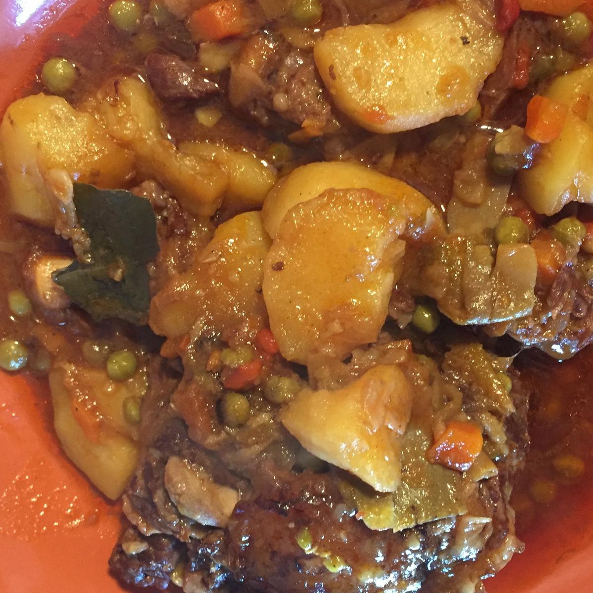 Cuando pase la hora abrimos las olla y le incorporamos las patatas cascadas que no cortadas ya se sino no desprenderán su almidón y no espesará la salsa. También añadiremos los gigantes y volveremos a tapar y una vez suba el segundo anillo dejaremos cocer 5 minutos más.