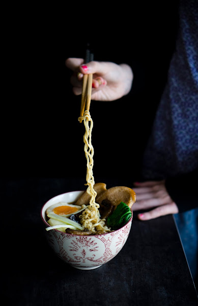 Y ahora emplatamos. En el fondo del bol ponemos 4 o 5 cucharadas del taré, 2 cucharadas de aceite aromatizado de cebolleta, incorporamos el caldo, introducimos los fideos hasta que sobresalgan, colocamos dos rodajas de panceta, un huevo partido por la mitad, el alga nori y cebolleta cruda picada. ¡¡¡¡Y listo!!!!