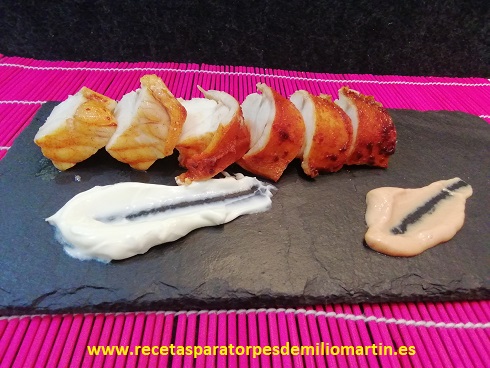 Cortar en ruedas gordas el calabacín y colocar la mitad encima de cada lomo de rape.