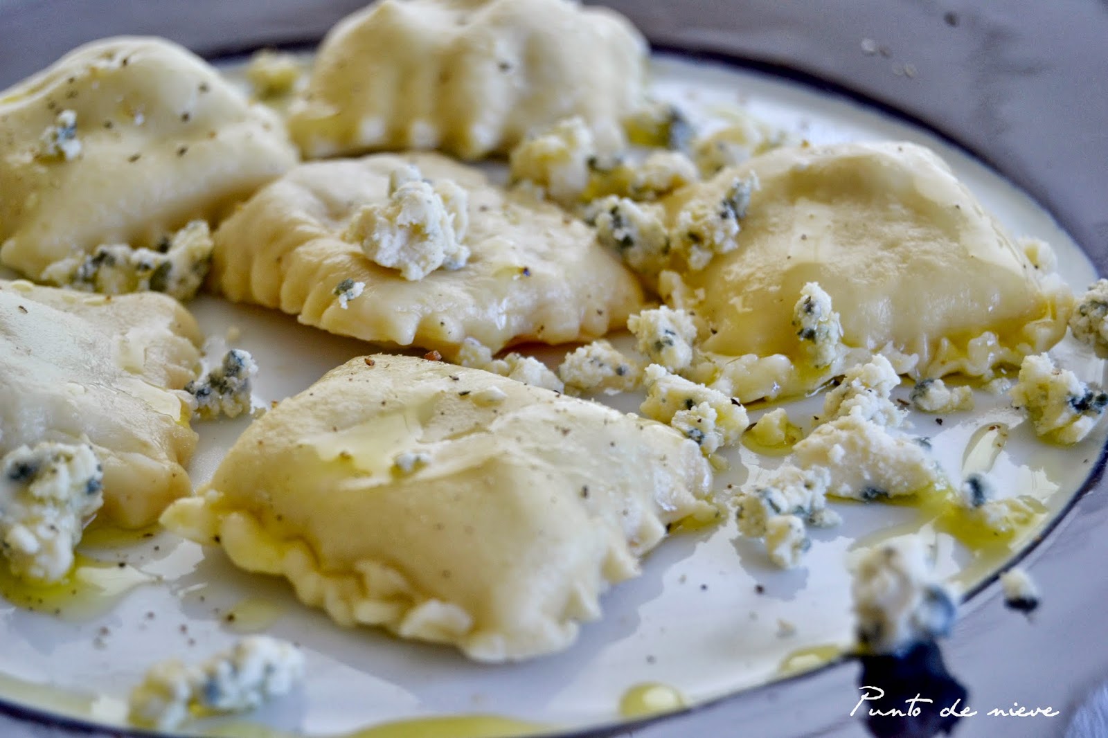 Finalmente, los sacamos con una espumadera y emplatamos. En cuanto a los raviolis de morcilla, quedan muy bien con un poco de cebolla caramelizada, sal, pimienta y un chorrito de aceite. Para los de bonito, utilicé trocitos de queso azul e, igualmente, un chorrito de aceite de oliva, sal y pimienta.