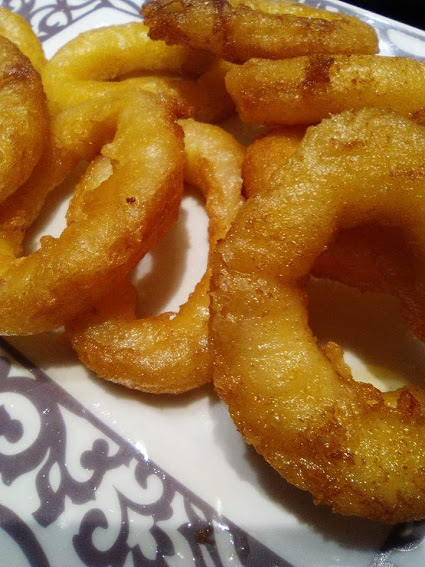 Cogemos las tiras de calamares y las pasamos por la mezcla del huevo, el agua, levadura, sal y harina. Las echamos al aceite bien caliente.