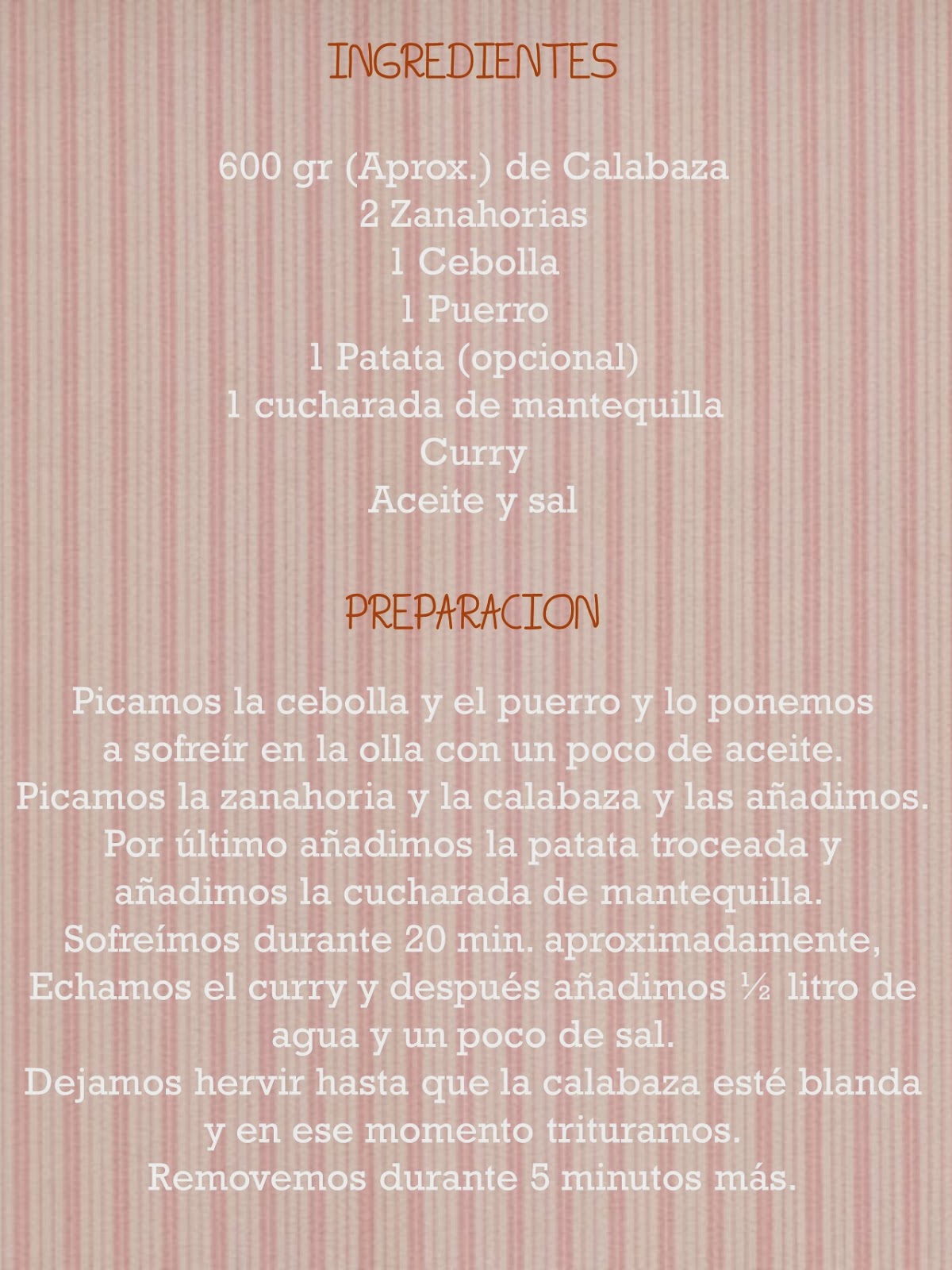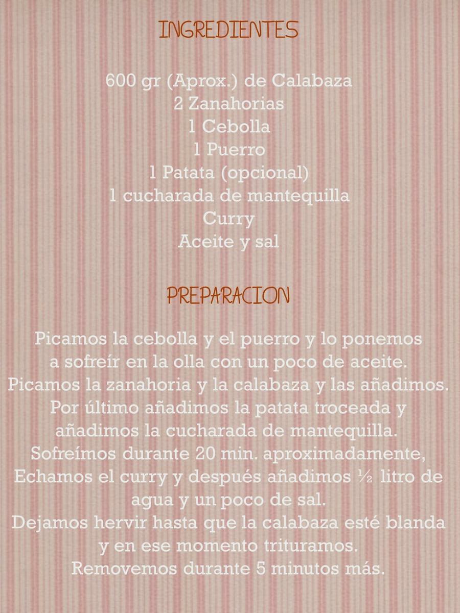 Crema de CalabazaHoy traigo una crema muy rica de calabaza, calentita y rápida de hacer, llena de vitaminas y con un color precioso.A mi todas las recetas que veo que llevancurry me encantan , es un condimento que me gusta mucho ,su sabor y su olor que impregna toda la casa....uhmmmm.Necesitamos:500 gr. de calabaza ya limpia1 patata1 puerro1 litro de caldo o agua con pastilla de caldoSal y Pimient ...