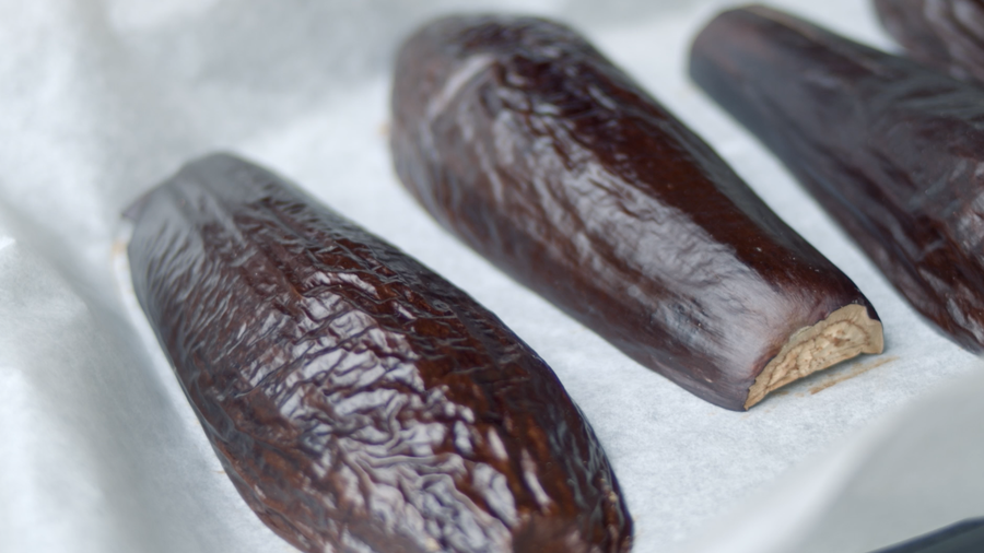 El primer paso, siendo sencillo, es el más difícil: hay que hornear las berenjenas. Para ello las cortamos a la mitad longitudinalmente, las ponemos en una bandeja sobre papel de horno y las horneamos unos 45 minutos a unos 220 grados Celsius.