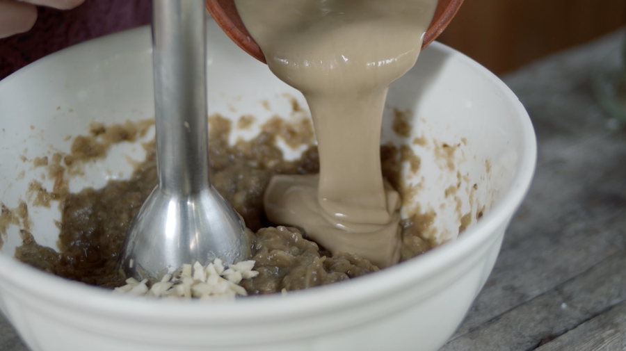 Hecho esto añadimos el resto de ingredientes y repetimos la operación hasta que resulte una crema suave y homogénea. Veréis cómo el tahini le aclara mucho el color. Con esto ya tendríamos finalizado el baba ganoush, pero...
