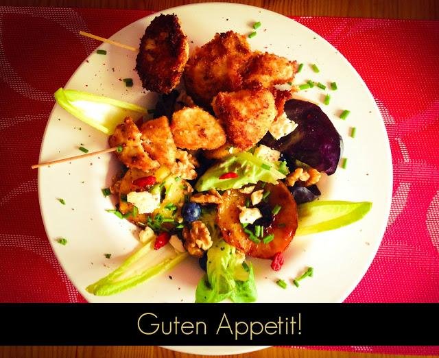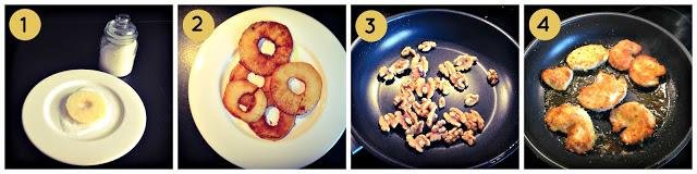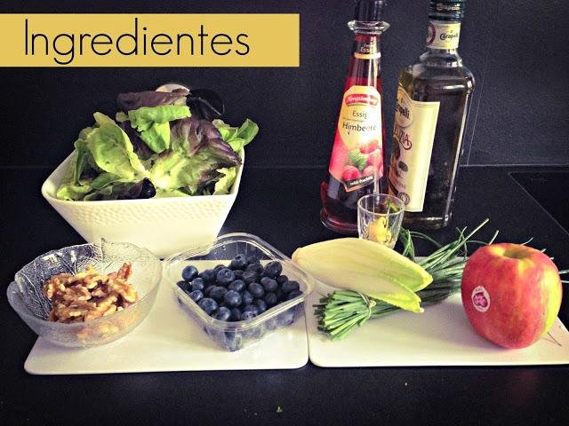 1 lechuga, 1 endivia, 40 gr nueces, 120 gr arándanos, 1 o 2 manzanas ácidas, azúcar, 100 gr de queso de cabra tipo feta y 3 cucharadas aceite de oliva + (opcional) carne, pan rallado.