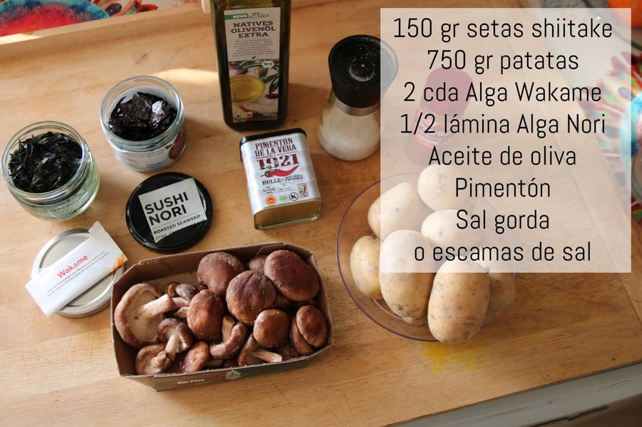 Los ingredientes que vamos a utilizar para esta receta son: setas shiitake, patatas, algas secas, pimentón, aceite de oliva y sal gorda.