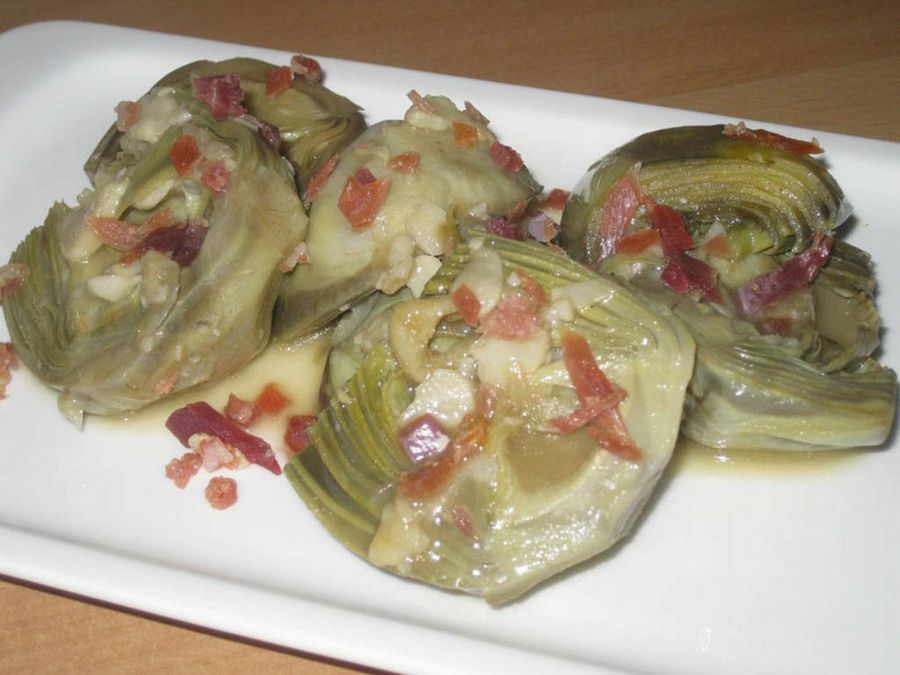 Ingredientes para 2 personas: 10-12 alcachofas frescas, jamón picado, sal, aceite de oliva, limón, 1/2 vaso de vino blanco.
