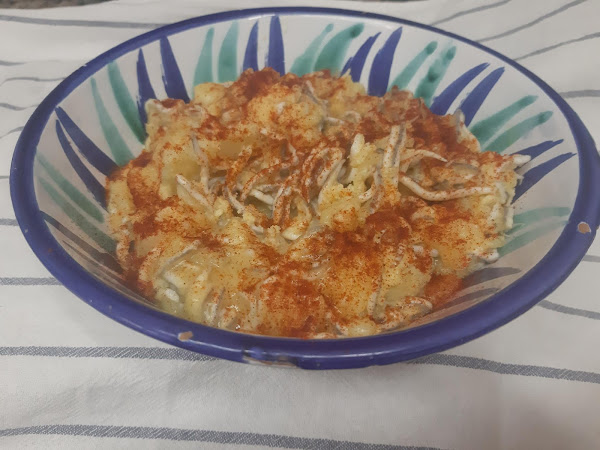 Ingredientes: carne del caldo del día anterior (2 trozos de espinazo, 1 trozo de hueso de jamón y 1 esqueleto de pollo), 2 patatas grandes, 1/2 litro de aceite de oliva, 2 huevos, sal, 4 dientes de ajo y ajo molido.