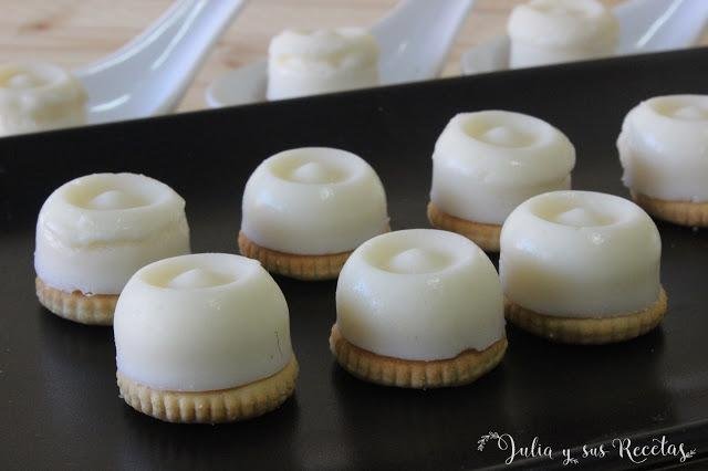 Estos bombones se preparan rallando el queso y derritiéndolo con la leche. Se añaden otros ingredientes, entre ellos gelatina neutra y se vierte la mezcla en moldes. Una vez cuajados se ponen sobre galletitas saladas y quedan la mar de ricos y graciosos.
