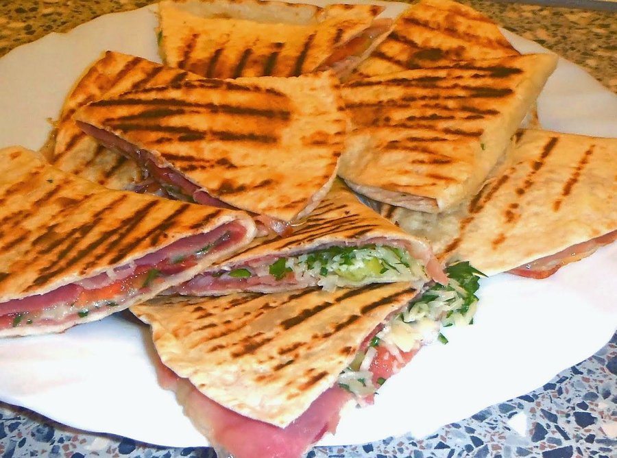 Necesitaremos algunas tortitas que rellenaremos de jamón, cebolleta, tomate, queso rallado... Luego se doblan en forma de media luna, se pintan con aceite y se cocinan vuelta y vuelta sobre una plancha. ¡Riquísimas!
