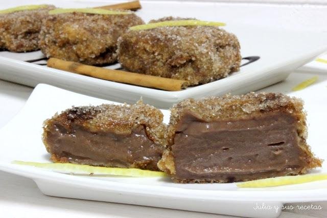 La versión tradicional de esta receta es sin chocolate pero es que fue ver esta de Julia y sus recetas y me la quise traer para aquí, ¡qué rico! Necesitamos: leche, harina, Maizena (harina de maíz refinada), azúcar, cacao en polvo, mantequilla, limón, canela, huevos, aceite de oliva virgen, azúcar y canela en polvo para rebozar. En un cazo ponemos las harinas, el azúcar, el cacao y la mitad de la leche. En otro cazo la otra mitad de la leche, la mantequilla , el limón y la canela, llevamos a ebullición, con cuidado de que no queden grumos. Luego mezclamos las dos preparaciones y llevamos al fuego para que espese sin dejar de remover. Ponemos en un recipiente plano tapado con papel film a piel. Luego cuando haya enfriado cortamos cuadrados, rebozamos con huevo y freímos y luego pasamos por azúcar y canela.