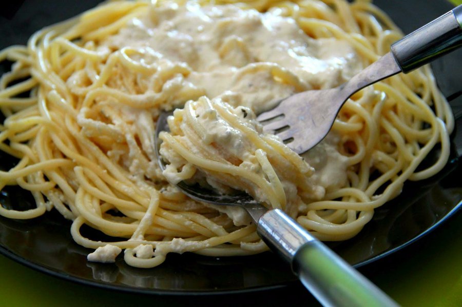 Una pasta muy sencilla y rápida, solo lleva: Pasta, nata (crema de leche), queso parmesano y albahaca. Nada más. Se cuece la pasta y se calienta la nata y se añade la albahaca cortada pequeña y el queso parmesano. Buen plato de pasta. Sí señora.