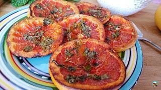 Se cortan los pomelos en rodajas y se espolvorean con hierbabuena y se asan durante 30 minutos a 180 grados.