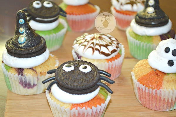 Dentro de las figuras que no pueden faltar como decoración en Halloween, están las arañas. ¿Qué te parece si haces un pastel que sea una de ellas? En el blog Cocinando con Montse, hacen uno muy realista. La base es un bizcocho de yogur que se cubre y decora con fondant negro y blanco y con tiras de regaliz.Cupcakes con forma de araña