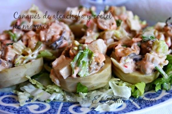 Necesitas: alcachofas enlatadas cortadas en corazones, coctel de marisco(mahonesa, marisco cocido)