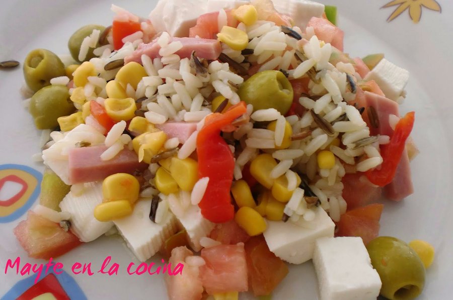 Necesitas: arroz salvaje, maiz, jamon, aceitunas