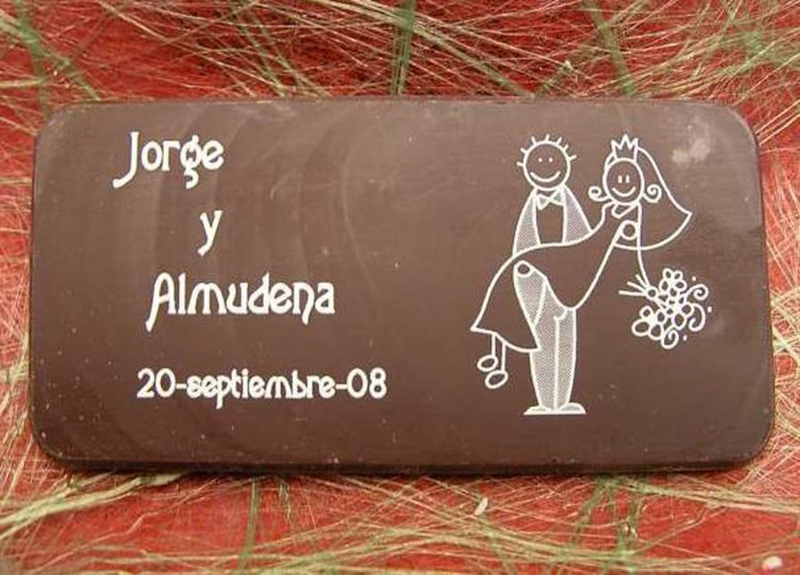 Los tradicionales recordatorios que contienen la fecha de la boda y algún dibujo o fotografía pueden ser más originales si los hacemos de chocolate, como los que muestra Fantasía de Chocolate. Con ellos puedes dejar a los invitados con la boca abierta, lo que se ajusta a su premisa de buscar “detalles que se salgan de lo normal y, además, con una gran calidad”.