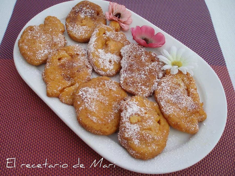 Cubrimos una sartén con el aceite y dejamos calentar bien. Vamos echando cucharadas grandes de la masa en la sartén y doramos las tortitas por ambas caras. Las dejamos enfriar sobre un papel absorbente. Una vez frías las espolvoreamos con azúcar glas.