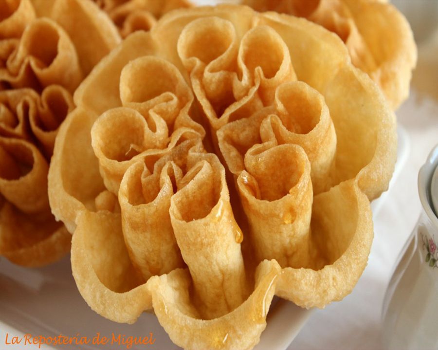 Ingredientes para 15 flores (aproximadamente): 300 gr de harina, 300 ml de agua, 6 huevos, miel, 1 pizca de sal, la cáscara de una naranja, molde especial para darle forma a las flores.