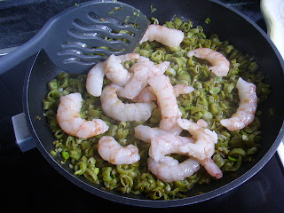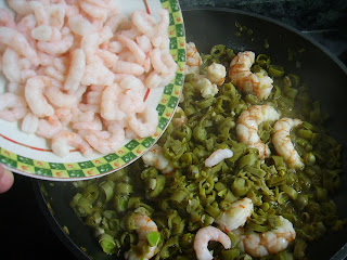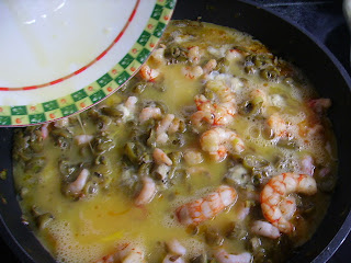 6.- Agregamos primero los gambones y dejamos cocer unos 3 minutos más y después ponemos las gambitas. Removemos para que coja sabor y esperamos a que evapore el jugo que sueltan.