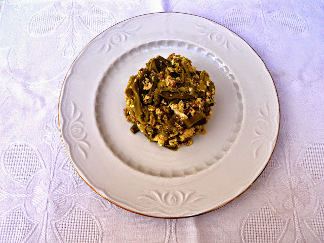 Esta receta del blog Olor a Hierbabuena, comparte ingrediente con la anterior. Es un revuelto de ajetes con jamón, que le da ese punto saladito que nunca falla.